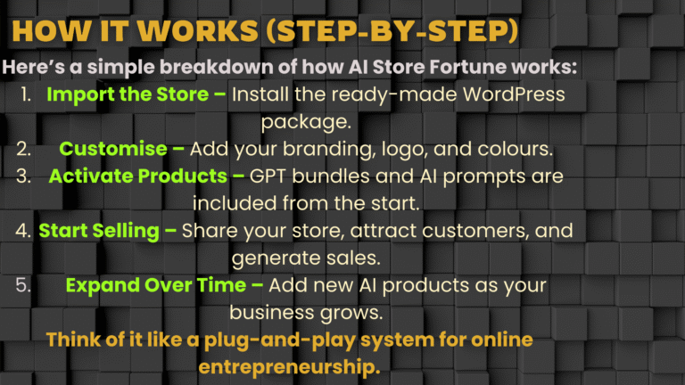 That’s exactly what AI Store Fortune offers. It’s a done-for-you store system built on WordPress, designed for marketers, entrepreneurs, and business owners who want to step into the fast-growing AI space.